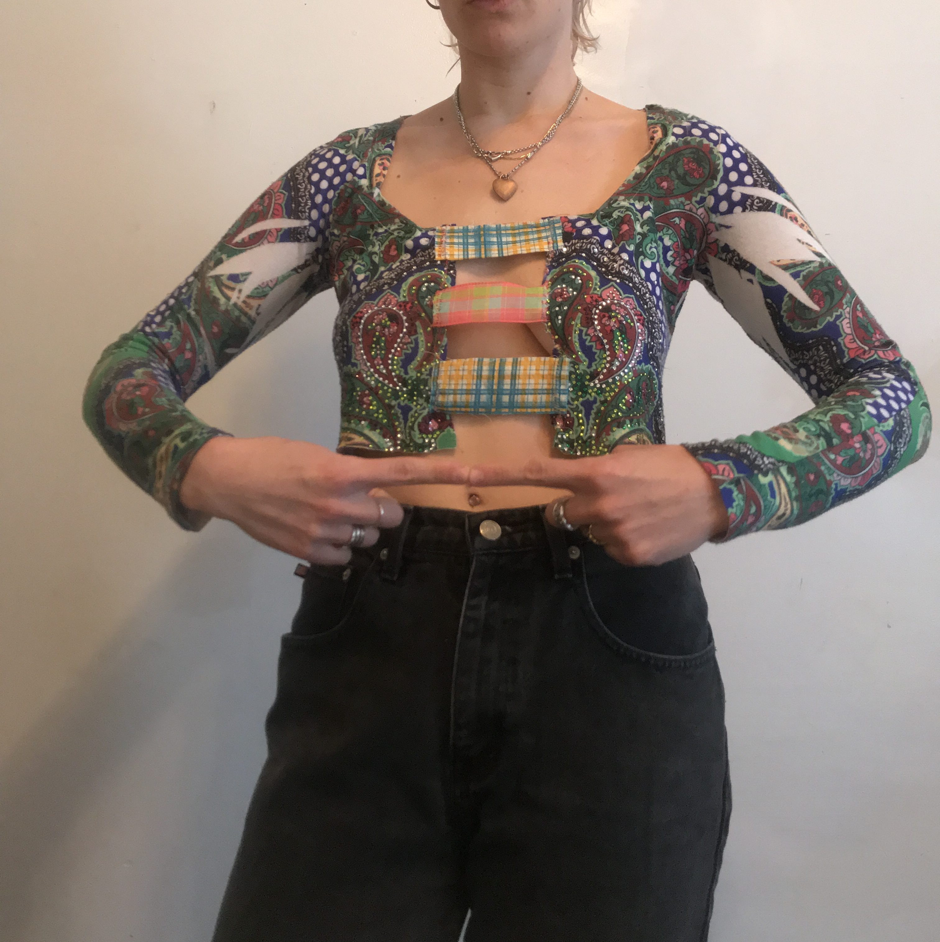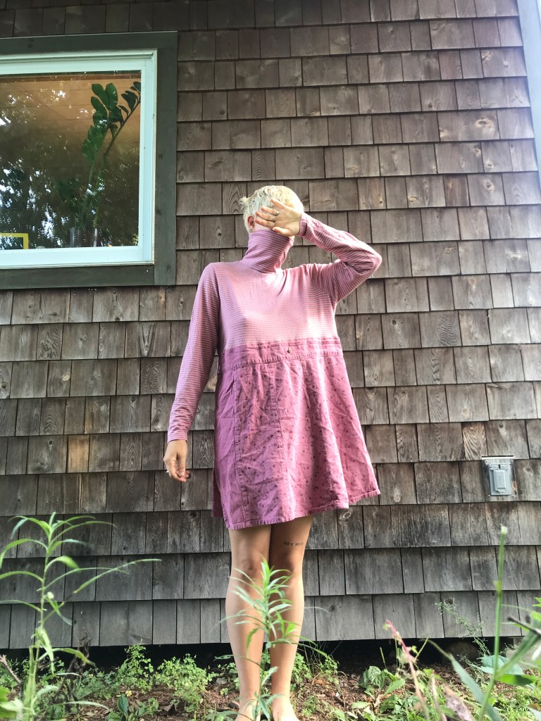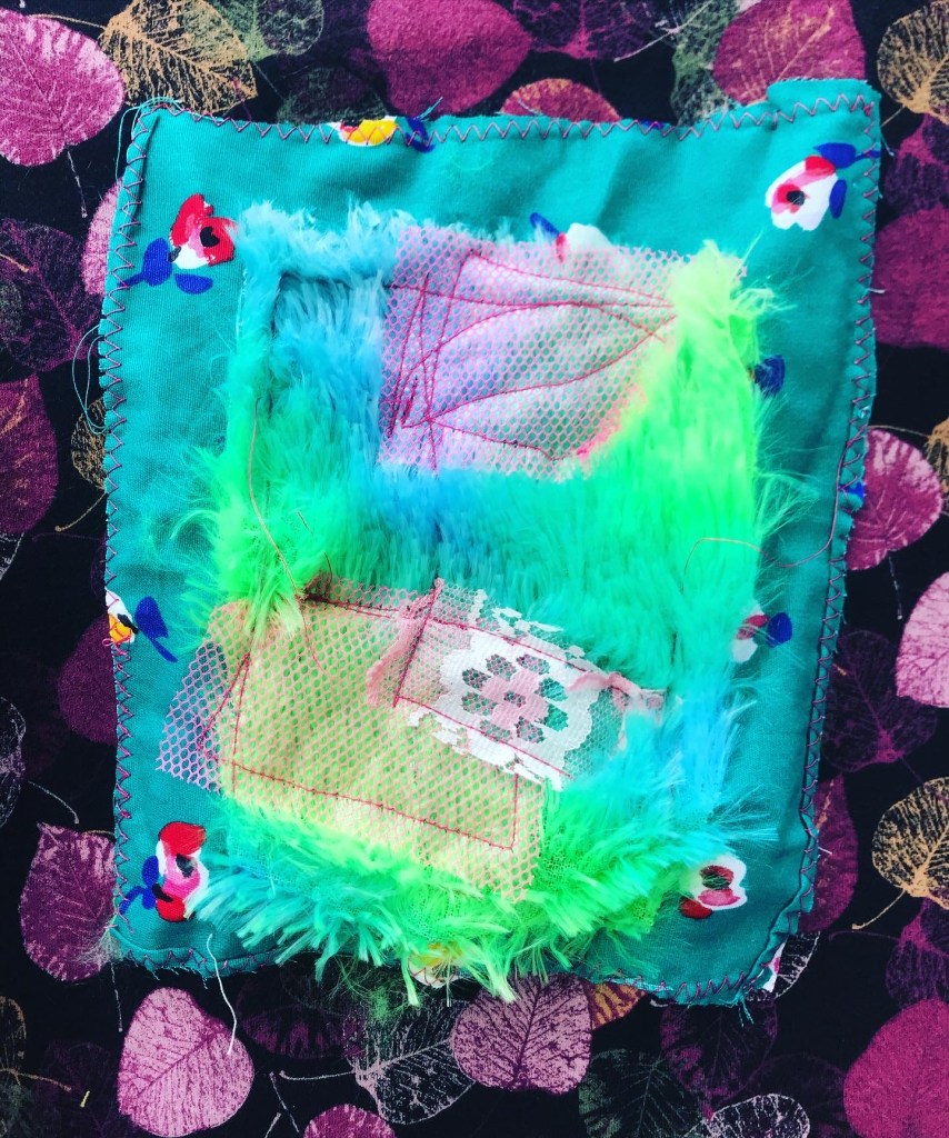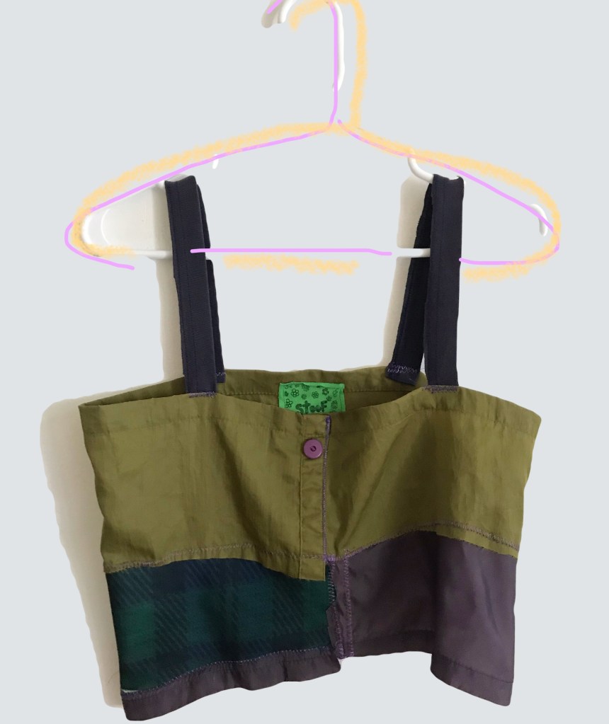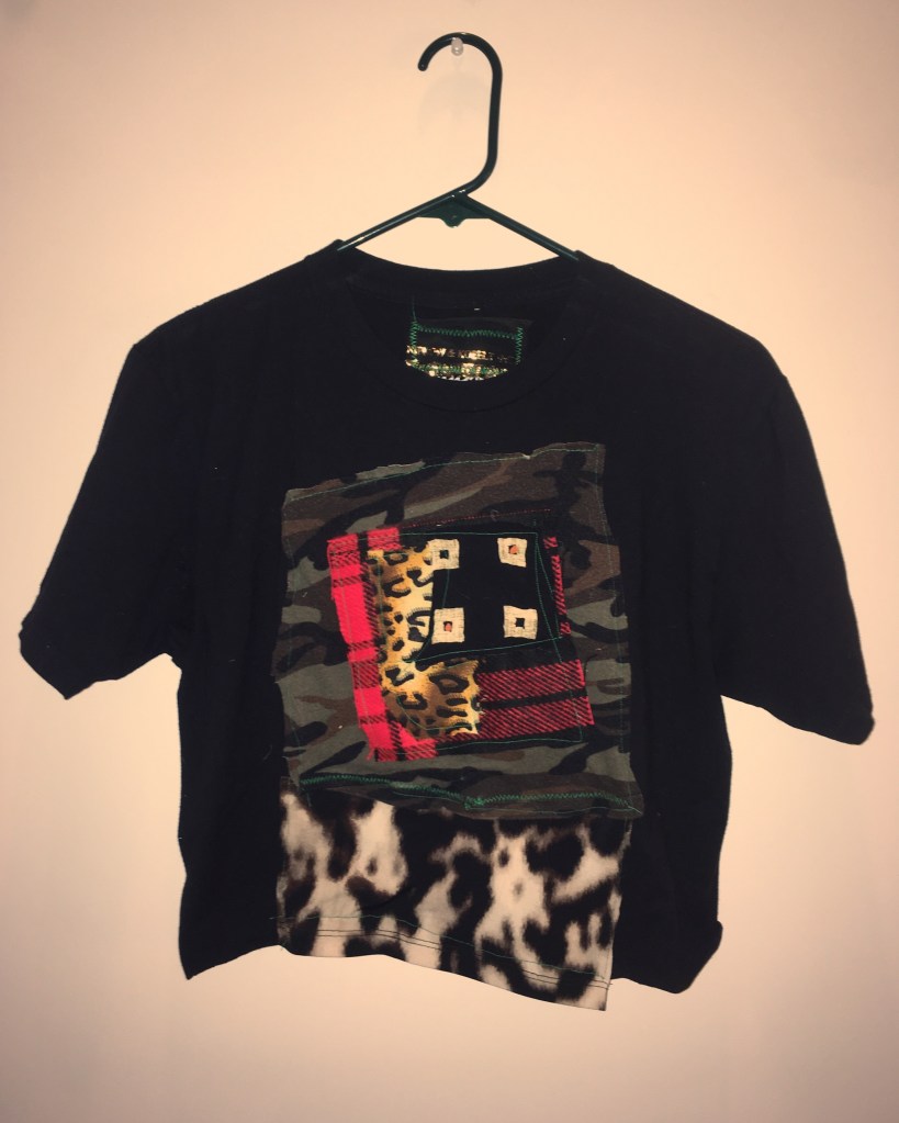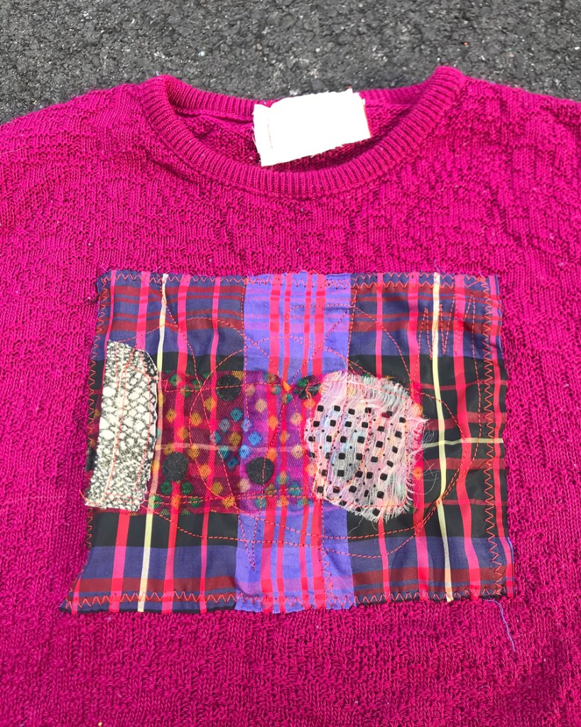 i dug out my kenmore sewing machine from my mom’s basement in 2018 and learned how to thread it again. i was working at a thrift store at the time and had access to lots of clothing that ended up in the free pile outside of the store. some of the clothes were stained or had simply been in the store for too long. i began taking bags of clothing home and cutting them up and piecing things back together, using what is known as “cut and sew” technique. it was freeing to use material that would likely otherwise be wasted. i began sewing simple squares onto the center of a t-shirt or sweater. i then began collaging pieces of fabric onto the squares, resulting in a one of a kind patch that i liked to believe protected the heart. with simple adjustments, pieces of clothing that were overlooked became interesting again. this experiment turned into a full blown side hustle. much of what i currently do has been informed by my work with clothing and fabric collaging. patchwork is both ornamental and functional. it can cover stains and fill holes. it can re-imagine the shape of clothing beyond the form of the body. i have a lot of humility around my work. it is meant to be playful and naive. it is meant to be affordable. it is meant to be worn.