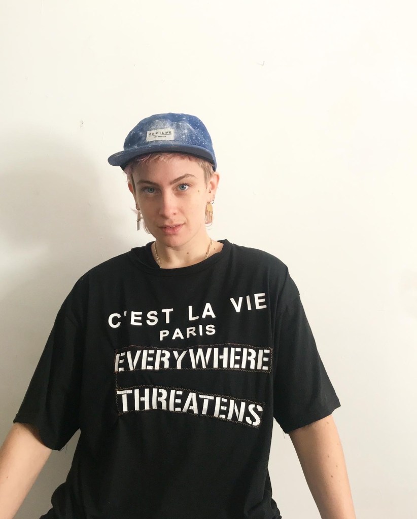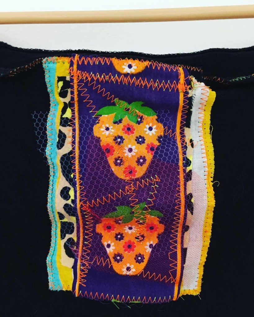 i dug out my kenmore sewing machine from my mom’s basement in 2018 and learned how to thread it again. i was working at a thrift store at the time and had access to lots of clothing that ended up in the free pile outside of the store. some of the clothes were stained or had simply been in the store for too long. i began taking bags of clothing home and cutting them up and piecing things back together, using what is known as “cut and sew” technique. it was freeing to use material that would likely otherwise be wasted. i began sewing simple squares onto the center of a t-shirt or sweater. i then began collaging pieces of fabric onto the squares, resulting in a one of a kind patch that i liked to believe protected the heart. with simple adjustments, pieces of clothing that were overlooked became interesting again. this experiment turned into a full blown side hustle (read: livelihood). much of what i currently do has been informed by my work with clothing and fabric collaging. patchwork is both ornamental and functional. it can cover stains and fill holes. it can re-imagine the shape of clothing beyond the form of the body. i have a lot of humility around my work. it is meant to be playful and naive. it is meant to be affordable. it is meant to be worn.